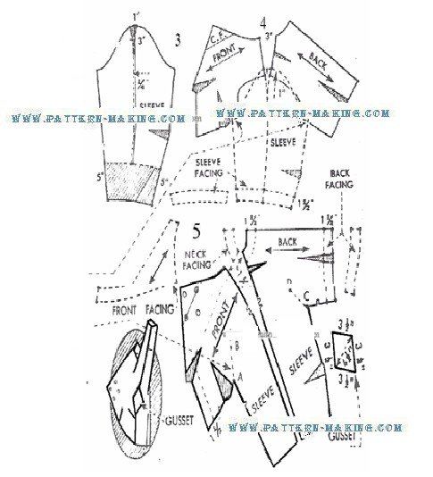 angle of these lines run from the underarm corner[A to C] to neck at shoulder]. Draft a diamond shaped gusset, 4-1/2” wide, and having each line, 3-1/2” long, to correspond with the slash lines on front and back.