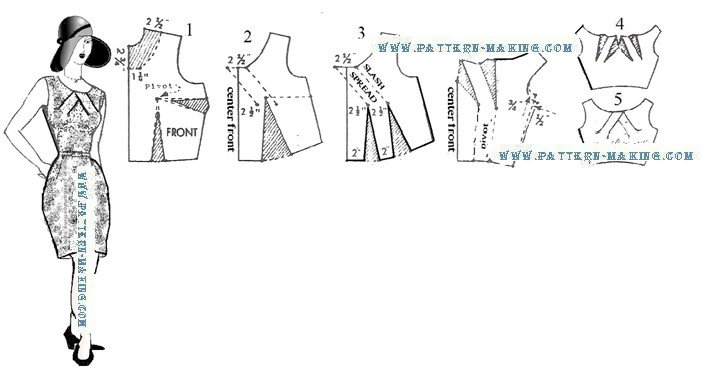 1) Using the dress foundation, trace front & back to waistline only; then extend the front dart up to the level of the side dart. Make waist dart 1/2″ wider [1/4” on each side of the dart], 4” above waistline Instead of the 1/4″ ease on back shoulder, make a dart, 1/2″ wide and 3” long at center shoulder seam; then add 1/4″ to shoulder seam beyond armhole as shown.