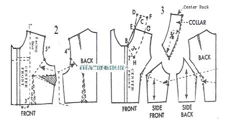 2) Draft front facing as shown; then trace facing and front in one section. To divide front and back into 4 sections, draw seam lines from armhole to top of the waist darts; then extend side dart to the dividing line as