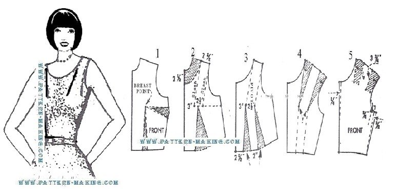 Then slash along the pleat lines and pivot shoulder darts 1/4″ to neckline and the other 3-2/4” next to armhole closing waist darts, reduce 1/4″ in an C.F. add 1/2″ at sides and reduce 3/4″ at armhole following arrows.
