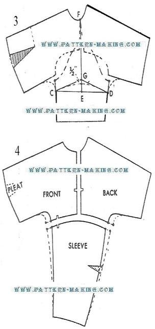 2) Place sleeve with top of cap overlapping 1/2″ beyond the front armhole at shoulder, and having points A and B at even distances from armhole and underarm seams of front and back; then trace sleeve A to C – 1-1/2” B to D – 1-1/2” C to D – Connect C to E – Half of C to D E to F – Connect for shoulder seam line. E to G – 2” C to G – Connect G to D – Connectkimono sleeve draft-13) Draw curved line from C to D, passing 1/2″ below point G. This becomes the seam line for the dropped shoulder style and divides the front and back from the sleeve. This seam is considered practical from the standpoint that the garment can be cut most economically in narrow width of material.