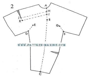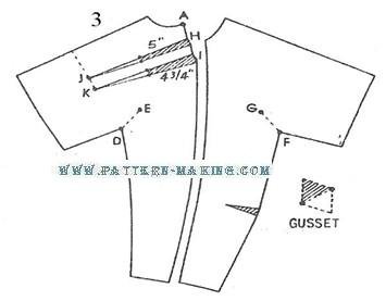 2) Divide width of sleeve in half from point B to lower edge, point C, as shown by dotted line. Draw diagonal slash lines for gusset, 3” long, from D to E, and from F to G. The angle of these lines can be located by placing ruler from D to A and F to A. For shoulder pleats in front draw lines as follows: A to H – 1-1/2”. H to I – 1”. J to K – 1”. H to J – Connect. I to K – Connect. 3) Separate front and back; then slash along shoulder pleat lines from H to J and I to K, and close up front dart, spreading at shoulder for pleats. Make pleat at H, 5” long, and 4-3/4” long at I. For gusset, draft diamond shaped section, making each line 3” long, to correspond with underarm slash be about 3” wide across center. The shaded part of gusset joins to front; the light part, to back. Seams are to be allowed on all sewing edges.