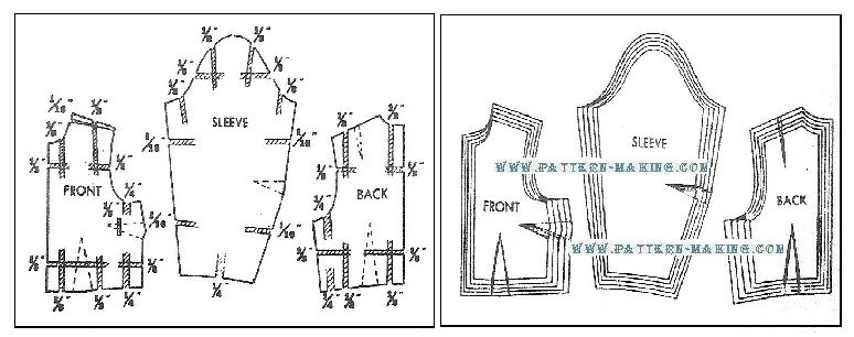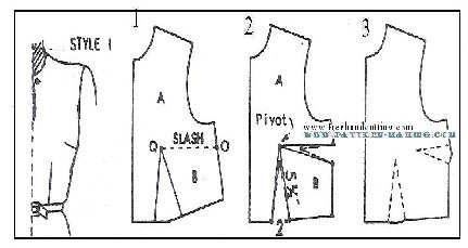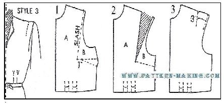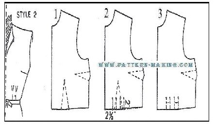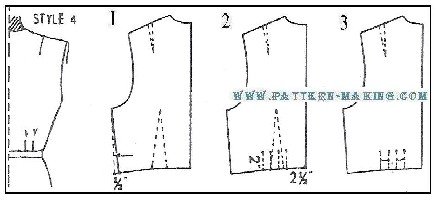 Darts, Tucks and Grading style 1 – front with side darts this style features side and waist darts which give it a smoother fit over the bust. using the bodice front foundation, make a side dart in pattern as follows: 1) slash along side dart line (o to q); then spread and make the waist dart 2” wide at waistline as shown in diagram 2. 2 and 3) draw v-shaped lines 4-1/2” long for side dart, and 5-1/2” long for waist dart (for size 16-1/2).style 2 – with side dart and waist tucks the tucks at waistline give the front a little extra fullness below the bust, and also a softer effect than with dart fitting. 1 and 2) trace outline of front (style 1); then trace the lines for the side ad waist darts. to replace the waist dart, make 2 tucks, 2” high, and drawing the 4 lines 1” apart. for size 16-1/2, make the first tuck 2-1/2” from center front. 3) completed front pattern with waist tucks.style 3 – with shoulder tuck at armhole especially suitable for the half size figure. 1 and 2) using the waist front pattern of style 2, draw slash line from shoulder (as near as possible to armhole) to a point 1″ away from the side dart. mark sections a and b; then slash and straighten side seam line. 3) mark the sewing lines for the shoulder tuck, 3″ long as shown.style 4 – back with waist tucks 1) trace outline of back bodice foundation; then trace the lines for shoulder and waist darts. 2 and 3) to replace the waist dart, make 2 tucks, 2” high, and draw the 4 lines 1” apart. for size 16-1/2, make the first tuck, 2-1/2” away from center back.grading half sizes diagrams below show where and how much to grade front, back and sleeve per size. chart below shows the grade of the bodice and sleeve in 5 sizes, 14 ½ , 16 ½, 18 ½, 20 ½, 22 ½.