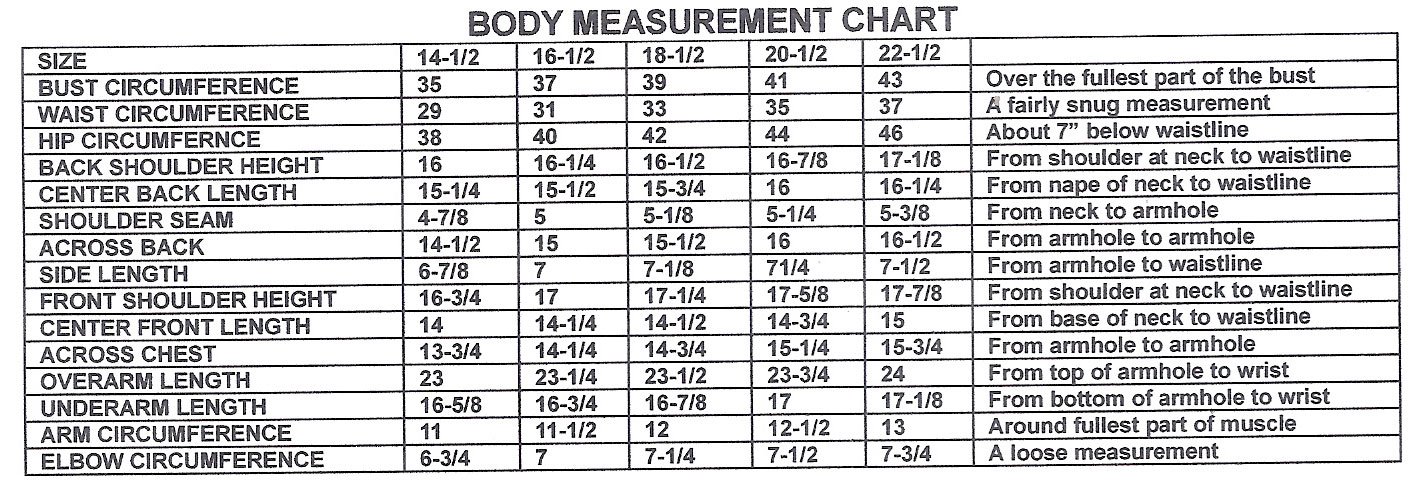 The body measurements listed below have been compiled in accordance with those used in the ready-to-wear trade.